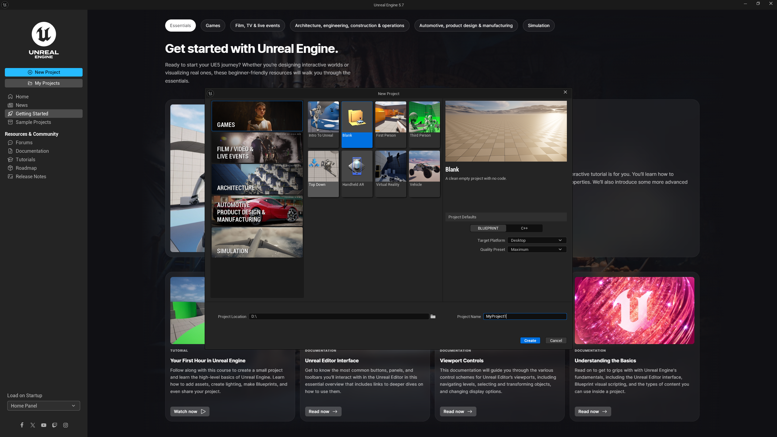 D드라이브에 Blank 템플릿과 블루프린트를 사용하는 MyProject1 을 생성합니다.